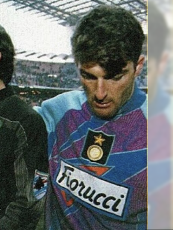 Here he is wearing a Reusch shirt with an Asics logo and Sampdoria crest sewed on, and a Tottenham shirt with Inter crest and sponsor sewed on.